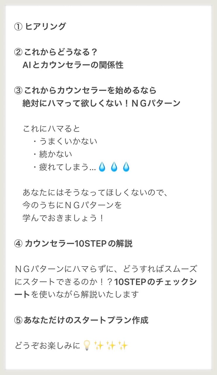 今回の講座では【カウンセラーをスムーズにスタートするための10項目】をチェックシートとして作りましたので、それを使いながら、あなた専用のスタートプランを一緒に作っていきます